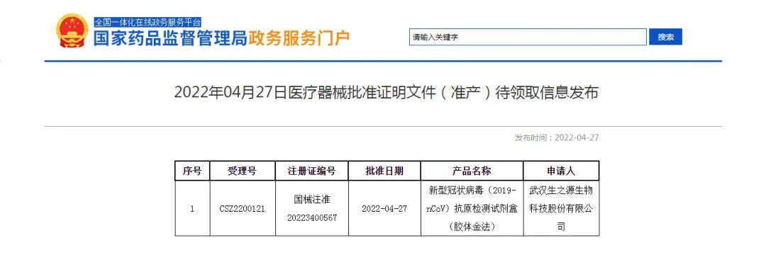 4月27日,武漢生之源生物科技股份有限公司研制的新型冠狀病毒(2019-nCoV)抗原檢測(cè)試劑盒(膠體金法)產(chǎn)品獲國家藥監(jiān)局批準(zhǔn)上市,是國內(nèi)第30家新冠抗原試劑獲批的企業(yè)。