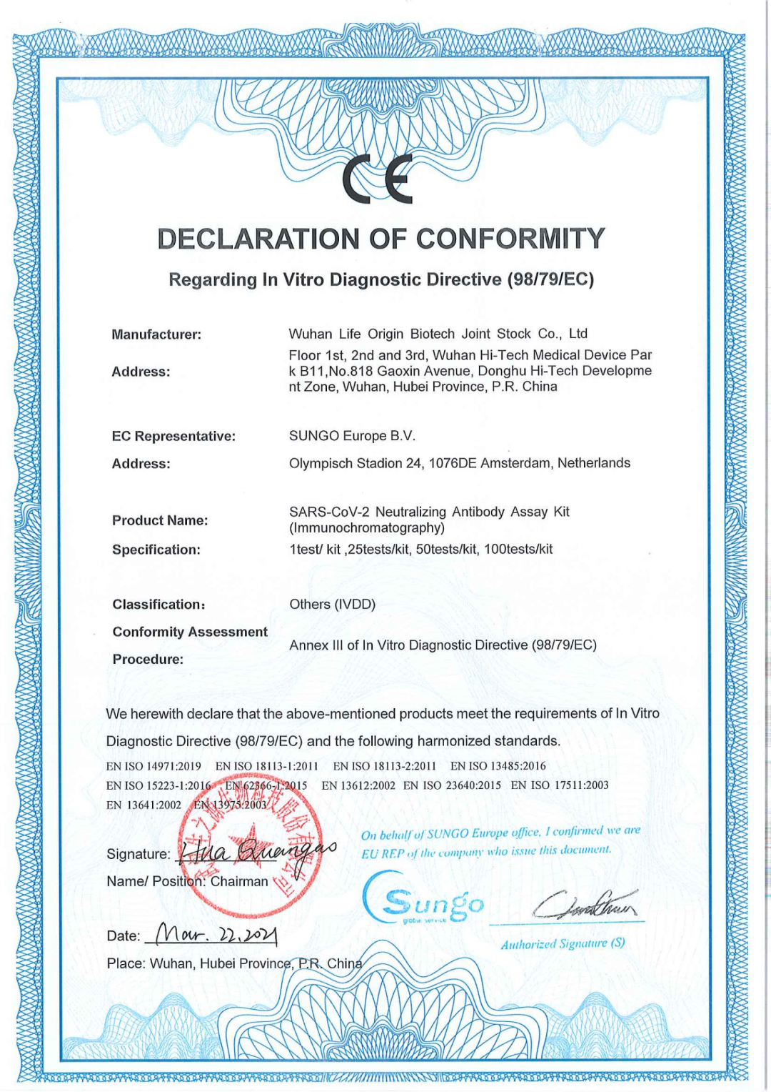 近日,生之源自主研發(fā)的幾種新冠產(chǎn)品完成歐盟CE認(rèn)證,標(biāo)志著我司產(chǎn)品符合歐盟相關(guān)指令的要求,已完成歐盟主管當(dāng)局登記注冊,具備歐盟市場的準(zhǔn)入條件。這是生之源繼新冠抗原拭子檢測試劑盒獲得CE認(rèn)證后的又一突破。產(chǎn)品包括:新型冠狀病毒(SARS-CoV-2)中和抗體檢測試劑盒:SARS-CoV-2 Neutralizing Antibody AssayKit(Immunochromatography)、新型冠狀病毒(SARS-CoV-2)中和抗體檢測試劑盒(膠體金):SARS-CoV-2 Neutralizing-Antibody Assay Kit(colloidal Gold)、新型冠狀病毒(SARS-CoV-2)中和抗體測定試劑盒(酶聯(lián)免疫法):SARS-CoV-2 Neutralizing Antibody Assay Kit (ELISA)、新冠/甲乙流聯(lián)檢試劑盒:SARS-CoV-2/Influenza VirusA/Influenza VirusB Antigen Assay Kit (Immunochromatography)(5)新型冠狀病毒抗原快速檢測試劑盒(唾液):COVID-19 Antigen Rapid Test Kit(Saliva)。