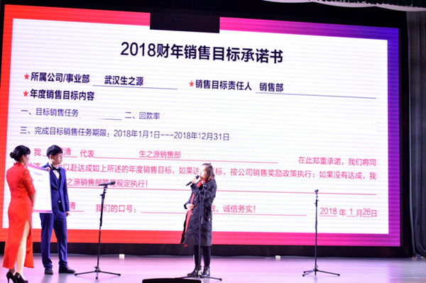 今年的年會與往年年會最大的不同為:增加了年度銷售目標(biāo)承諾的環(huán)節(jié)。生之源各區(qū)域的銷售代表上臺,對2018年的銷售業(yè)績立下目標(biāo)。言語之間,充滿了豪情壯志。