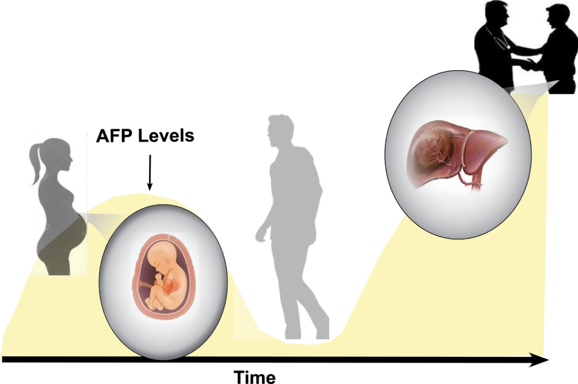 當(dāng)人肝組織發(fā)生癌性惡變或良性再生時(shí),甲胎蛋白的基因會被再次激活而高度表達(dá),并且隨著肝細(xì)胞受損程度的加重,AFP水平急劇升高(圖1)。肝癌患者的肝癌細(xì)胞能合成并分泌AFP,因此AFP是肝細(xì)胞癌篩查或監(jiān)測的重要腫瘤標(biāo)志物。其他類型的腫瘤,包括胃癌、卵黃囊腫瘤、胰腺癌、肺癌以及生殖細(xì)胞腫瘤中也能觀察到AFP水平升高的現(xiàn)象。