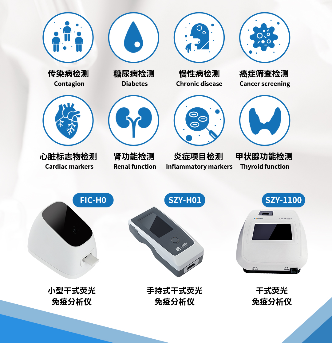 自 2007 年成立以來,我們深耕醫(yī)療健康產(chǎn)業(yè) 18 年,始終以 “用生物技術(shù)服務(wù)健康生活” 為使命,憑借 ISO 13485 質(zhì)量管理體系認(rèn)證、CE 認(rèn)證的品質(zhì)保障,解決方案已服務(wù)全球 20 余個國家和地區(qū)的醫(yī)療機(jī)構(gòu)。展會現(xiàn)場,我們將展示核心成果:檢測項目覆蓋傳染?。‵lu A/B)、糖代謝(HbA1C)、炎癥類項目(CRP)、心臟標(biāo)志物(NT-ProBNP)、癌癥篩查(TK1)等適用場景,同步展出FIC-H0小型、SZY-H01手持式、SZY-1100三款干式熒光免疫分析儀,以干式熒光免疫技術(shù)為核心,為多場景精準(zhǔn)診斷提供穩(wěn)定支撐。我們始終以技術(shù)創(chuàng)新為引擎,致力于推動醫(yī)療健康產(chǎn)業(yè)進(jìn)步,為全球客戶提供高質(zhì)量的精準(zhǔn)診斷解決方案。