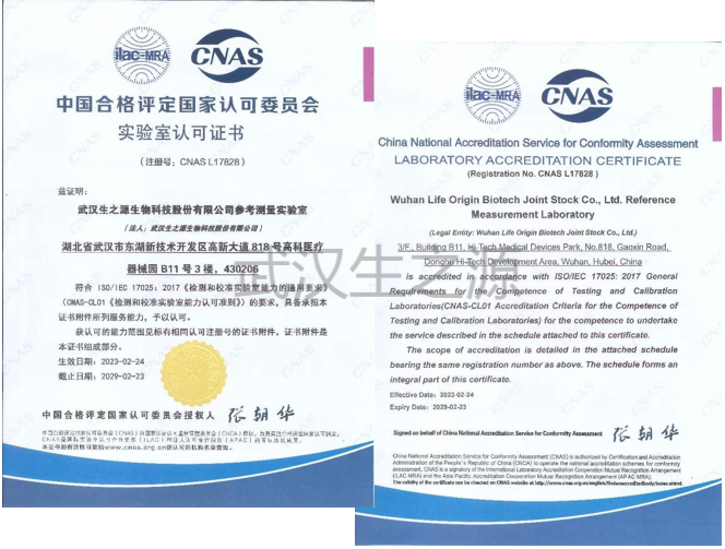 近日,武漢生之源生物參考測量實(shí)驗(yàn)室獲得中國合格評定委員會(CNAS)正式頒發(fā)的認(rèn)可證書(CNAS-CL01+CNAS-CL07),成為湖北省第一家通過CNAS認(rèn)可的參考測量實(shí)驗(yàn)室。