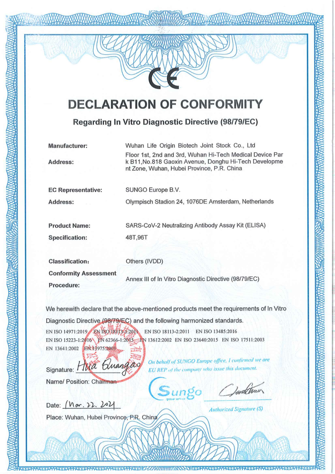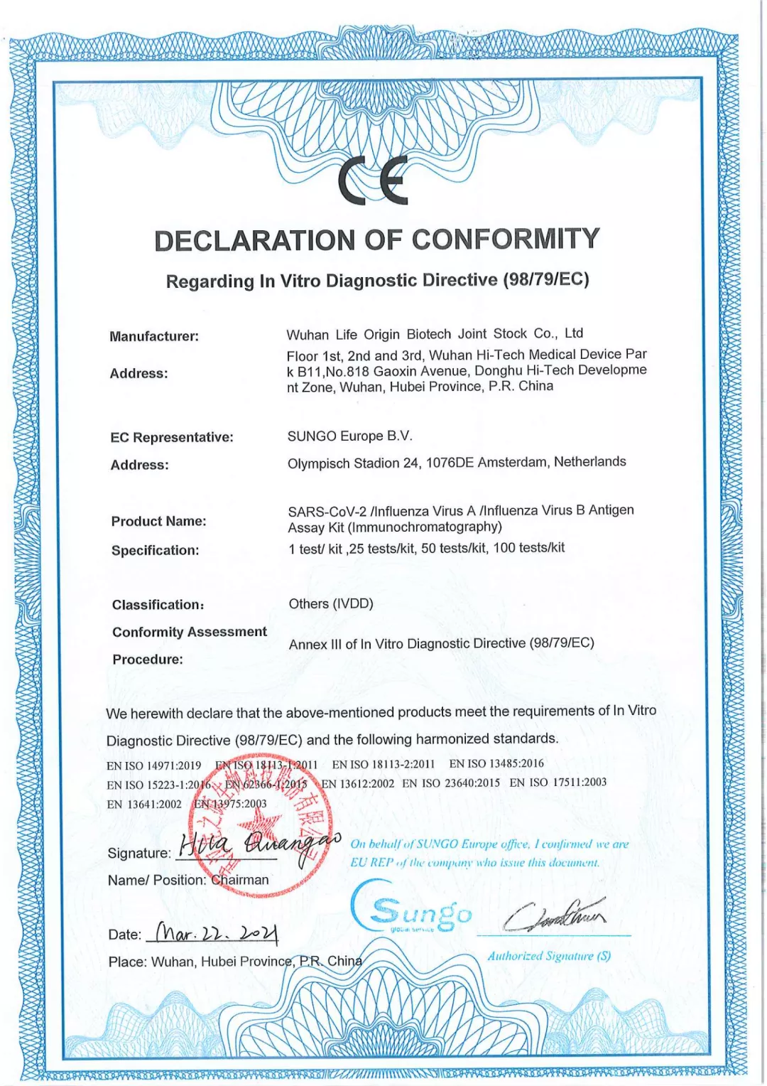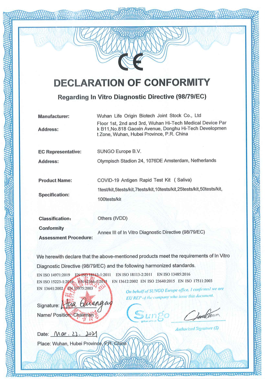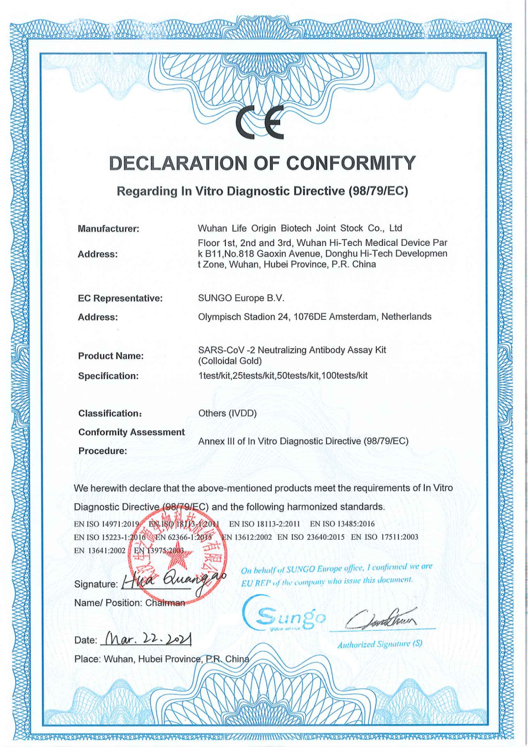 近日,生之源自主研發(fā)的幾種新冠產(chǎn)品完成歐盟CE認(rèn)證,標(biāo)志著我司產(chǎn)品符合歐盟相關(guān)指令的要求,已完成歐盟主管當(dāng)局登記注冊,具備歐盟市場的準(zhǔn)入條件。這是生之源繼新冠抗原拭子檢測試劑盒獲得CE認(rèn)證后的又一突破。產(chǎn)品包括:新型冠狀病毒(SARS-CoV-2)中和抗體檢測試劑盒:SARS-CoV-2 Neutralizing Antibody AssayKit(Immunochromatography)、新型冠狀病毒(SARS-CoV-2)中和抗體檢測試劑盒(膠體金):SARS-CoV-2 Neutralizing-Antibody Assay Kit(colloidal Gold)、新型冠狀病毒(SARS-CoV-2)中和抗體測定試劑盒(酶聯(lián)免疫法):SARS-CoV-2 Neutralizing Antibody Assay Kit (ELISA)、新冠/甲乙流聯(lián)檢試劑盒:SARS-CoV-2/Influenza VirusA/Influenza VirusB Antigen Assay Kit (Immunochromatography)(5)新型冠狀病毒抗原快速檢測試劑盒(唾液):COVID-19 Antigen Rapid Test Kit(Saliva)。
