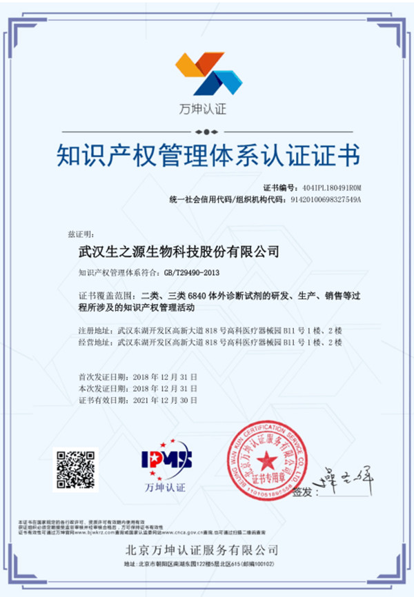 繼獲得“高新技術(shù)企業(yè)”、“企業(yè)技術(shù)中心”、建立“博士后科研工作站”、“諾貝爾獎(jiǎng)得主蘭迪謝克曼工作站”后,武漢生之源憑借專業(yè)的研發(fā)團(tuán)隊(duì)和技術(shù)創(chuàng)新,于2018年12月通過(guò)知識(shí)產(chǎn)權(quán)管理體系認(rèn)證。