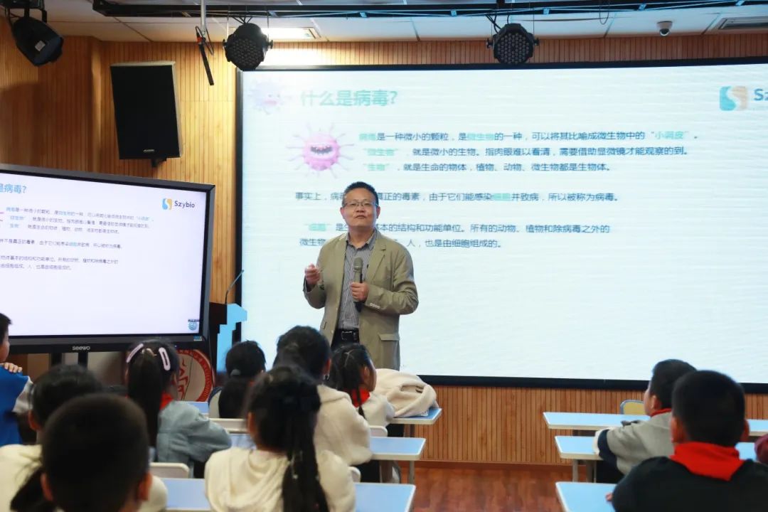 華權(quán)高以病毒的起源為切入點,用幽默風(fēng)趣的語言、生動形象的方式,從什么是病毒、身邊有哪些常見病毒、為什么要檢測病毒、怎么檢測病毒、生活中如何預(yù)防病毒感染、科學(xué)家在病毒檢測中做了哪些貢獻(xiàn)六個方面,為同學(xué)們講解了病毒相關(guān)知識。