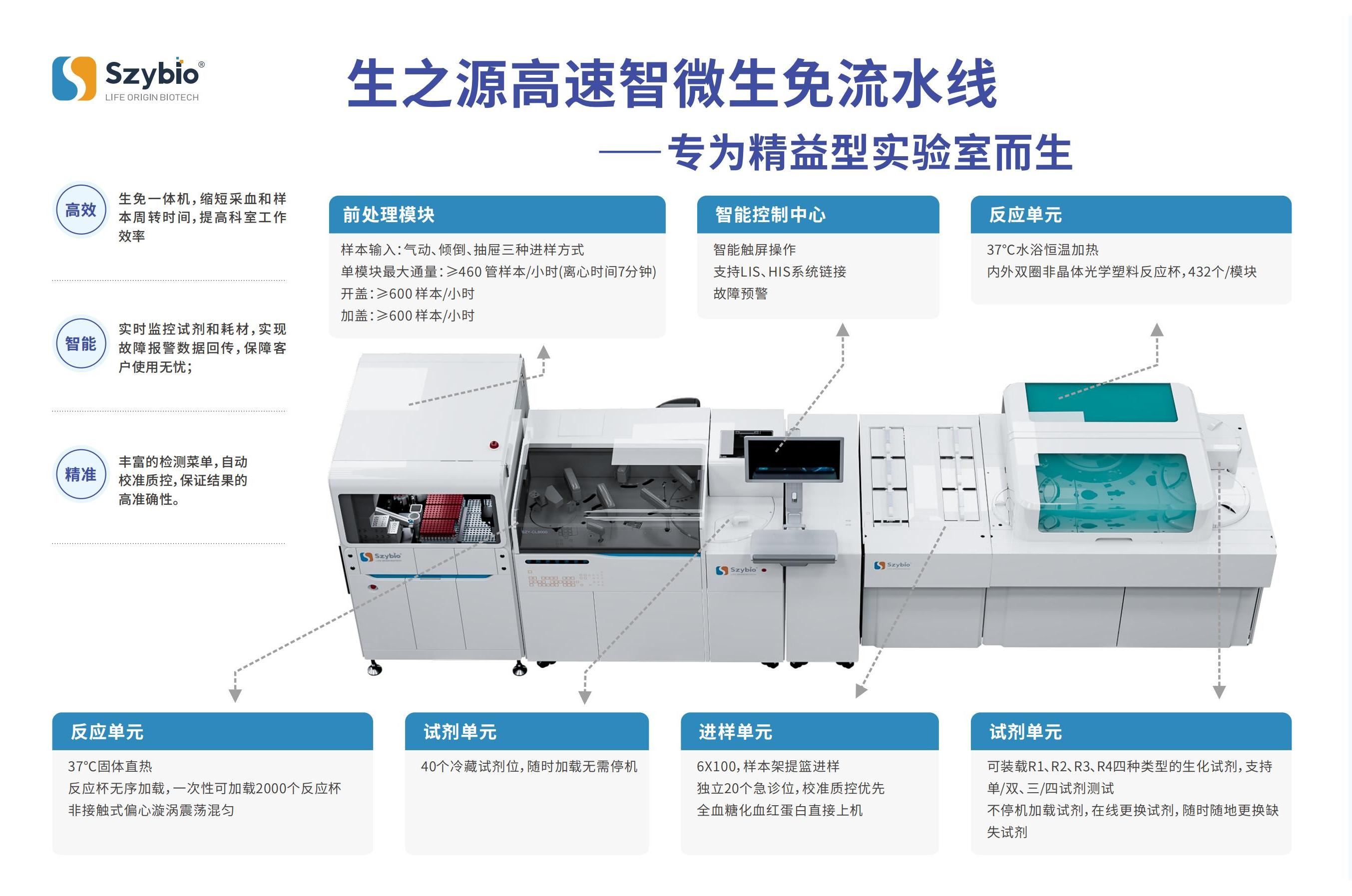 生之源高速極簡生免流水線配備20個(gè)獨(dú)立急診通道與600個(gè)樣本位,支持血清、尿液等多類型樣本批量處理;全流程自動(dòng)化管理實(shí)現(xiàn)24小時(shí)不間斷運(yùn)行,試劑針具備智能保護(hù)功能,內(nèi)置完善質(zhì)控體系,確保檢測高效精準(zhǔn)。前處理模塊每小時(shí)處理≥600樣本,智能控制中心支持LIS/HIS系統(tǒng)連接與故障預(yù)警,40個(gè)冷藏試劑位支持不停機(jī)加載,37℃恒溫反應(yīng)單元保障高效檢測,顯著提升實(shí)驗(yàn)室工作效率。