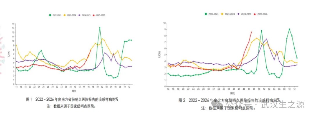 2025年第47周,南方省份流感樣病例占門急診病例總數(shù)百分比(ILI%)為7.8%,北方省份為8.6%,不僅顯著高于前一周水平,也遠(yuǎn)超2022-2024年同期水平,表明門急診診療壓力急劇增加。